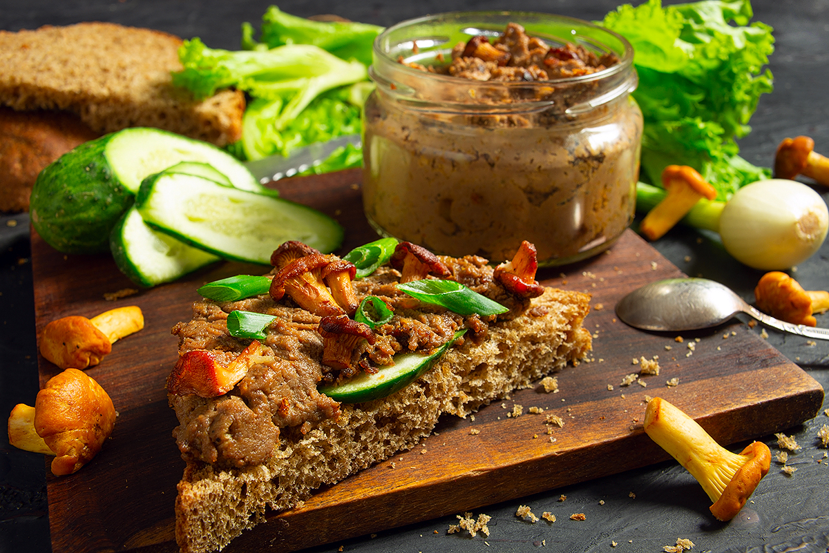 На приготовление печеночного паштета с морковью, луком и лисичками понадобится меньше часа, и какие же вкусные бутерброды на завтрак можно с этим паштетом приготовить!