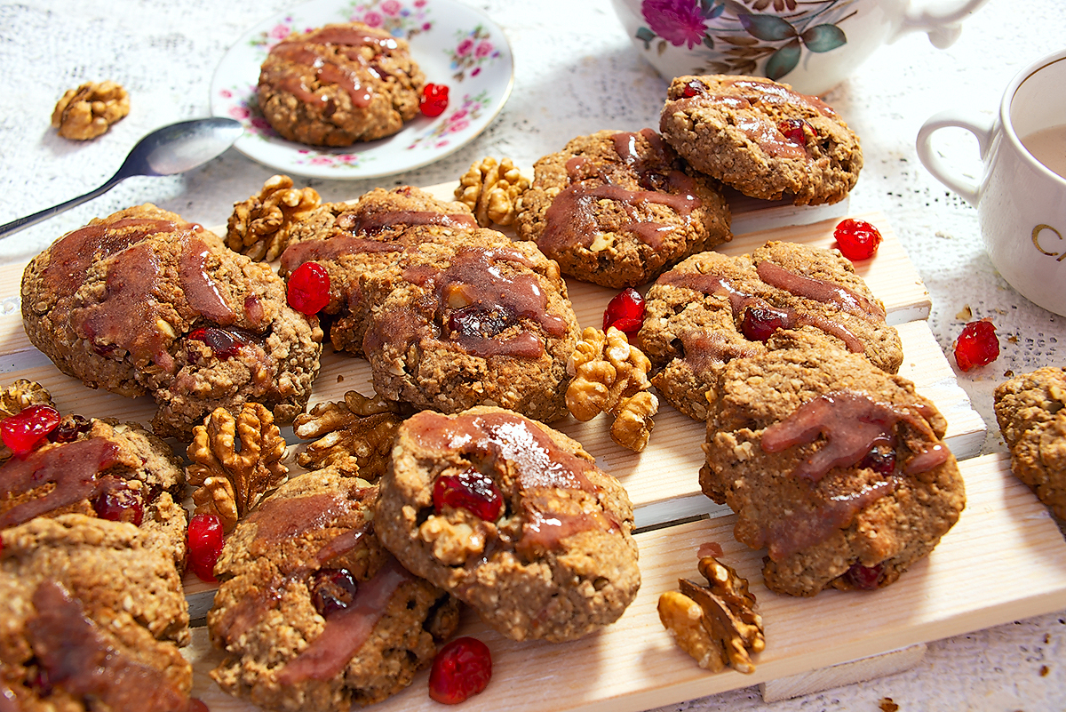 Овсяное печенье с огуречным рассолом, орехами, вишней и кленовым сиропом. Рецепт без сахара.